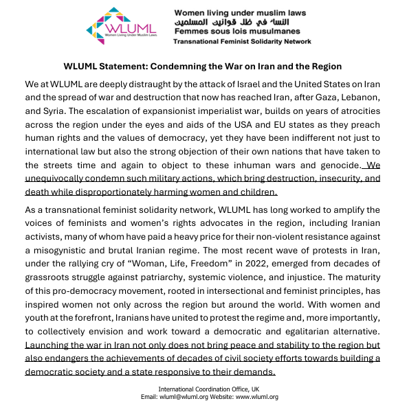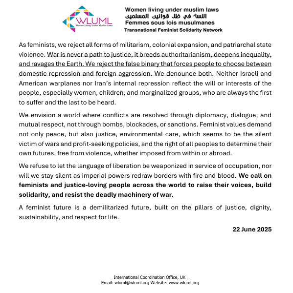We at WLUML are deeply distraught by the attack of Israel and the United States on Iran and the spread of war and destruction that now has reached Iran, after Gaza, Lebanon, and Syria. The escalation of expansionist imperialist war, builds on years of atrocities across the region under the eyes and aids of the USA and EU states as they preach human rights and the values of democracy, yet they have been indifferent not just to international law but also the strong objection of their own nations that have taken to the streets time and again to object to these inhuman wars and genocide. We unequivocally condemn such military actions, which bring destruction, insecurity, and death while disproportionately harming women and children.